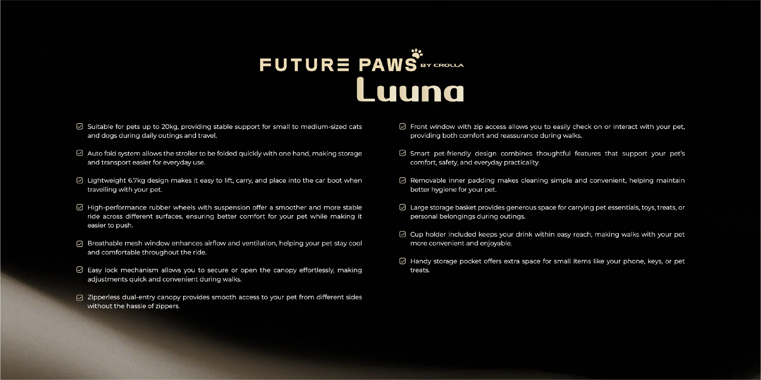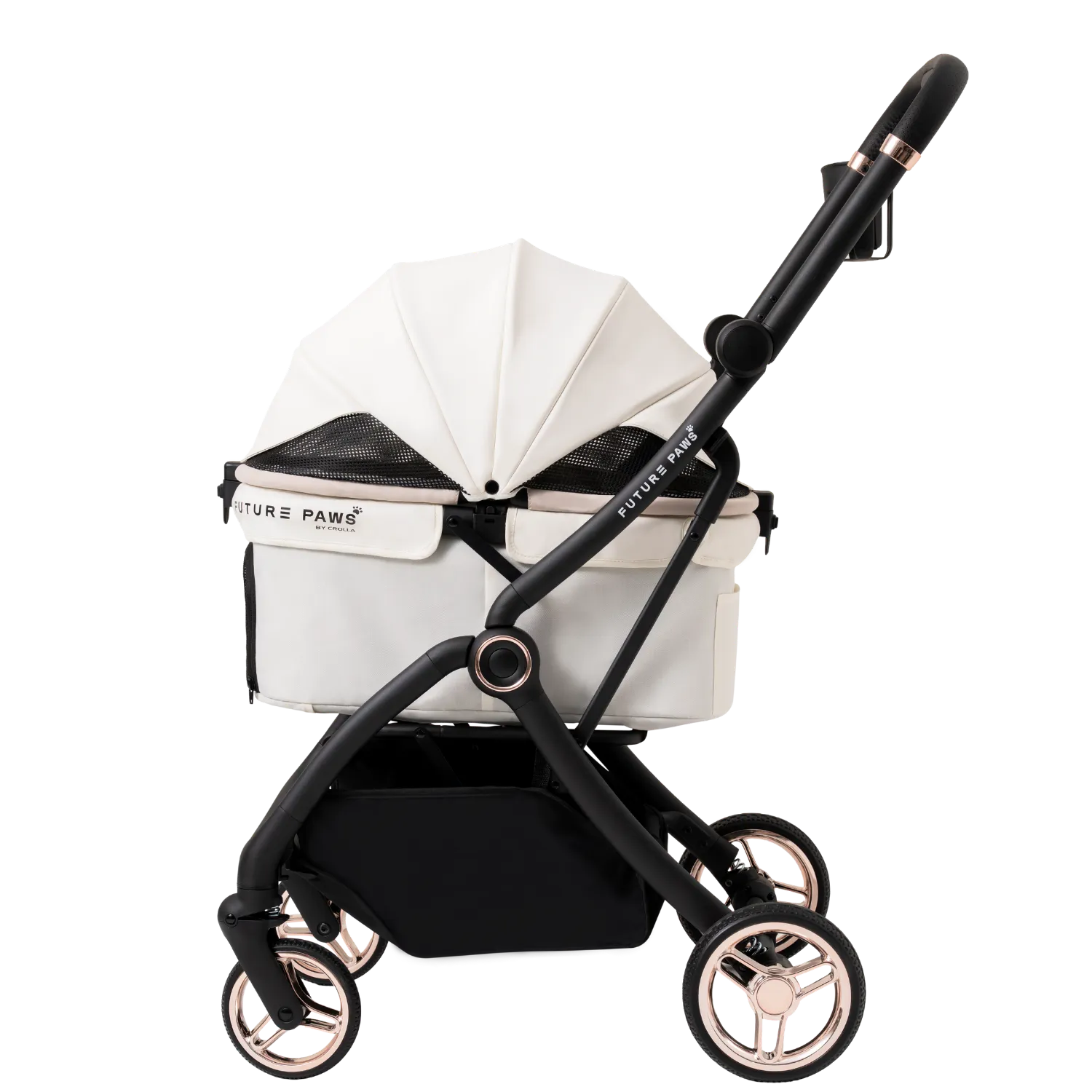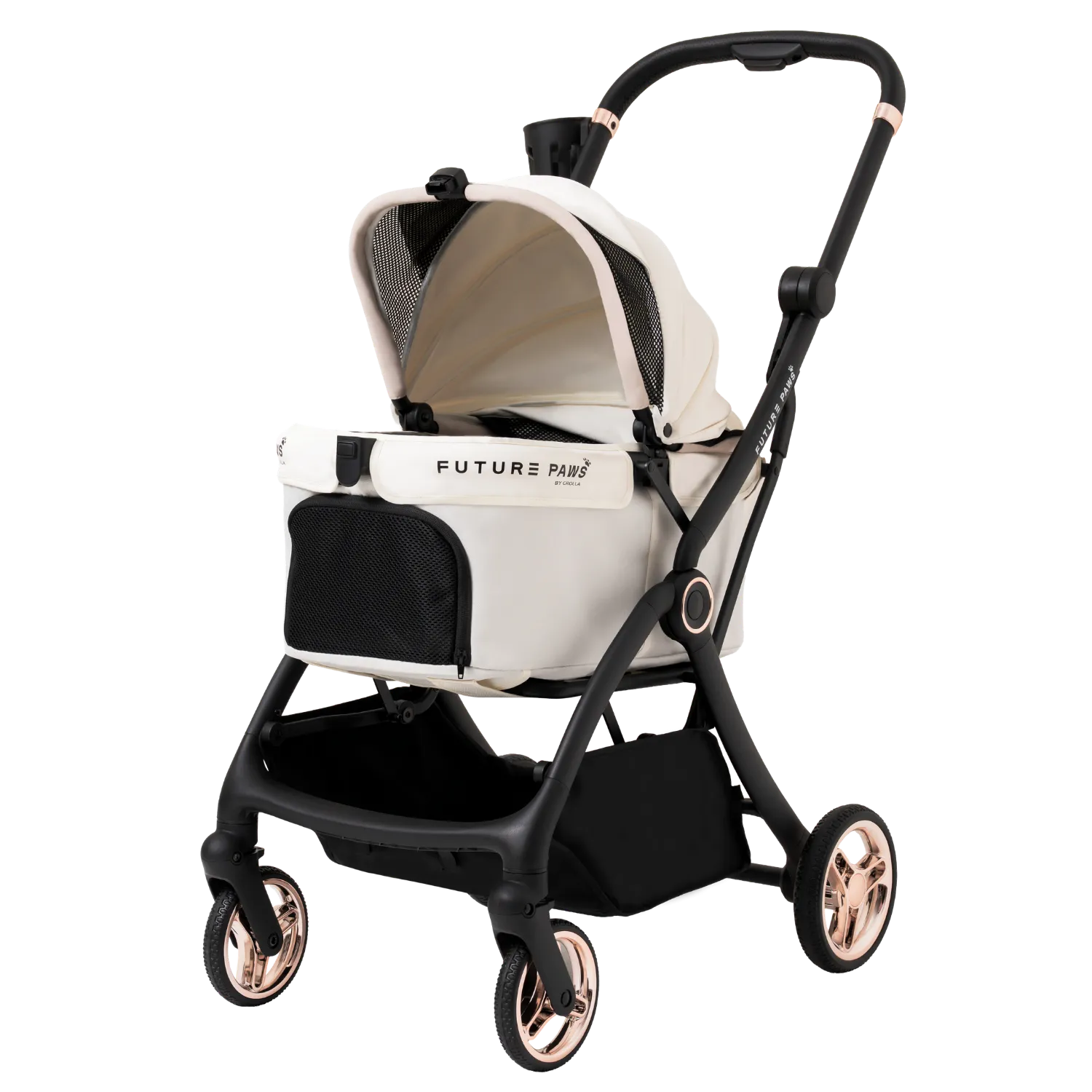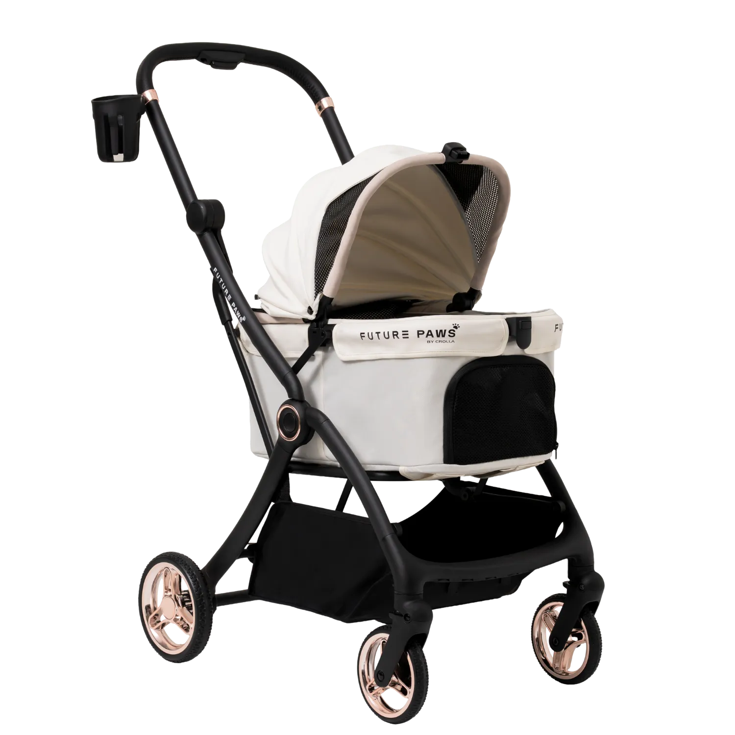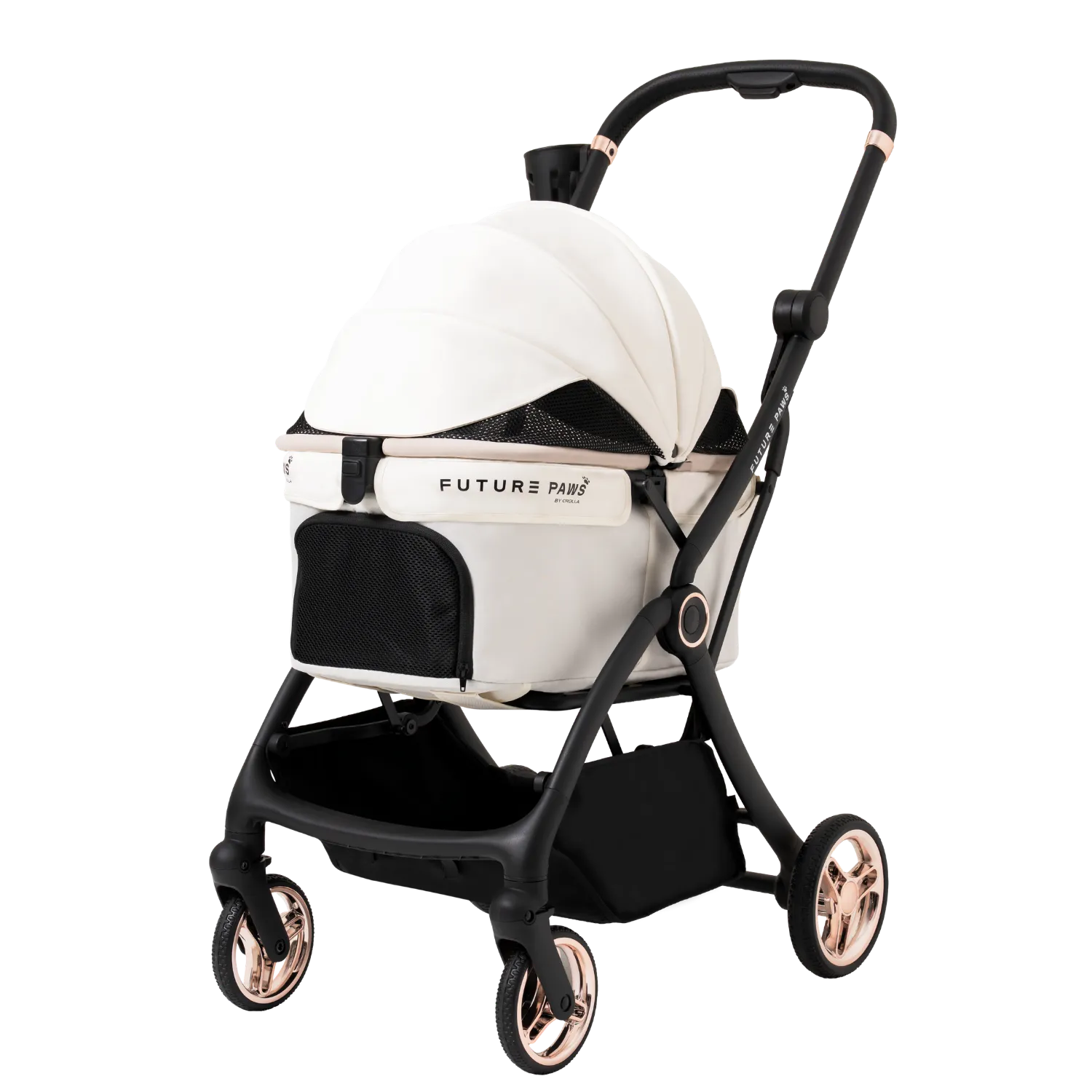 A lightweight stroller for pets up to 20 kg with one-step auto fold. Features a dual-entry canopy, high-performance wheels with suspension, and removable padding for comfort and easy cleaning. Large storage basket and cup holder make every outing simple and convenient.